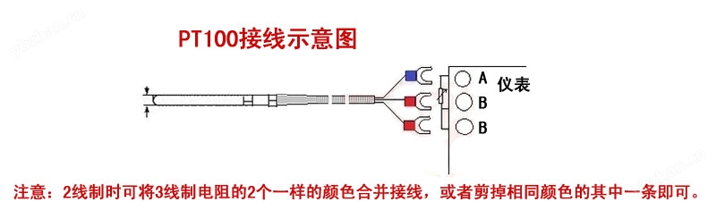 PT1000热电阻为一体化结构,采用进口双槽滚压工艺,防水性能更优异,实现了全面防水防腐功能,在恶劣环境中可以长期使用。 三线制PT100热电阻接线方式: 3线制pt100一般是一根红线二根白线,红线为A,二根白线都是B,二根B线(白线)都是一样的,可以按标识的A.B.B接口接上线即可。PT100是一个可变电阻,阻值随温度的变化而变化,当温度在0度的时候,量测AB(红白)两根线的阻值是100欧,100度是138.5欧,有两根白线是因为其中一根白线为补偿线,也可以两条白线装在一个接口当两线用,接三线是为了抗干扰,这样可以减少反馈到控制器的误差。