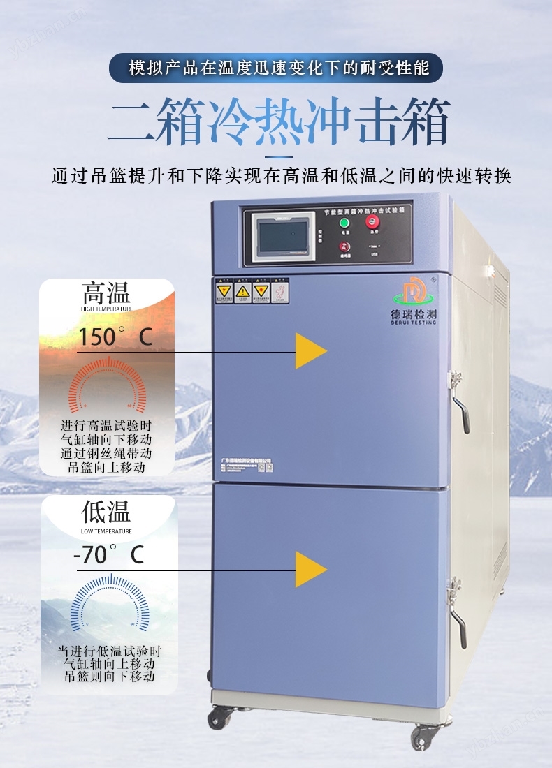 温度冲击试验箱通常采用两箱式或三箱式结构。测试样品在高温区和低温区之间移动,或通过风门切换气流路径,实现快速温度变化。德祥小型台式机型多采用两箱式设计,通过机械传动或气动方式转移样品,避免测试过程中的外界干扰。