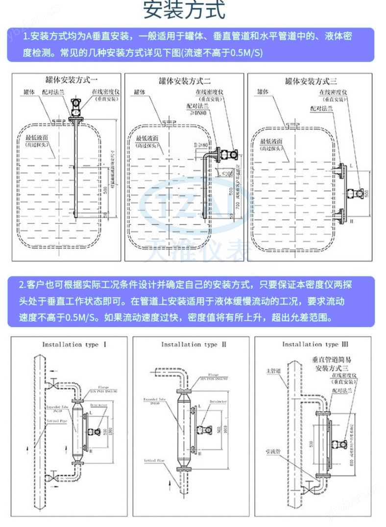 1、在线密度计适用于流动或静止液体, 适合于管道和罐体安装。