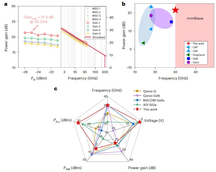 凭借优化的Y型栅电极结构,相较于传统T型栅电极,具有更大截面积(更低栅电阻)和更低寄生电容的优异特性,因此在尺寸缩减过程中,具有超过其他所有材料的高频性能,同时也是除三五族材料(InP/InGaAs)外,唯一一个实现截止频率达到1THz的半导体材料。基于改进的阵列碳纳米管射频器件,进一步制备出的毫米波放大器实现了30GHz下21.4dB的增益,具有与GaN、GaAs等材料商用器件相媲美的放大性能。